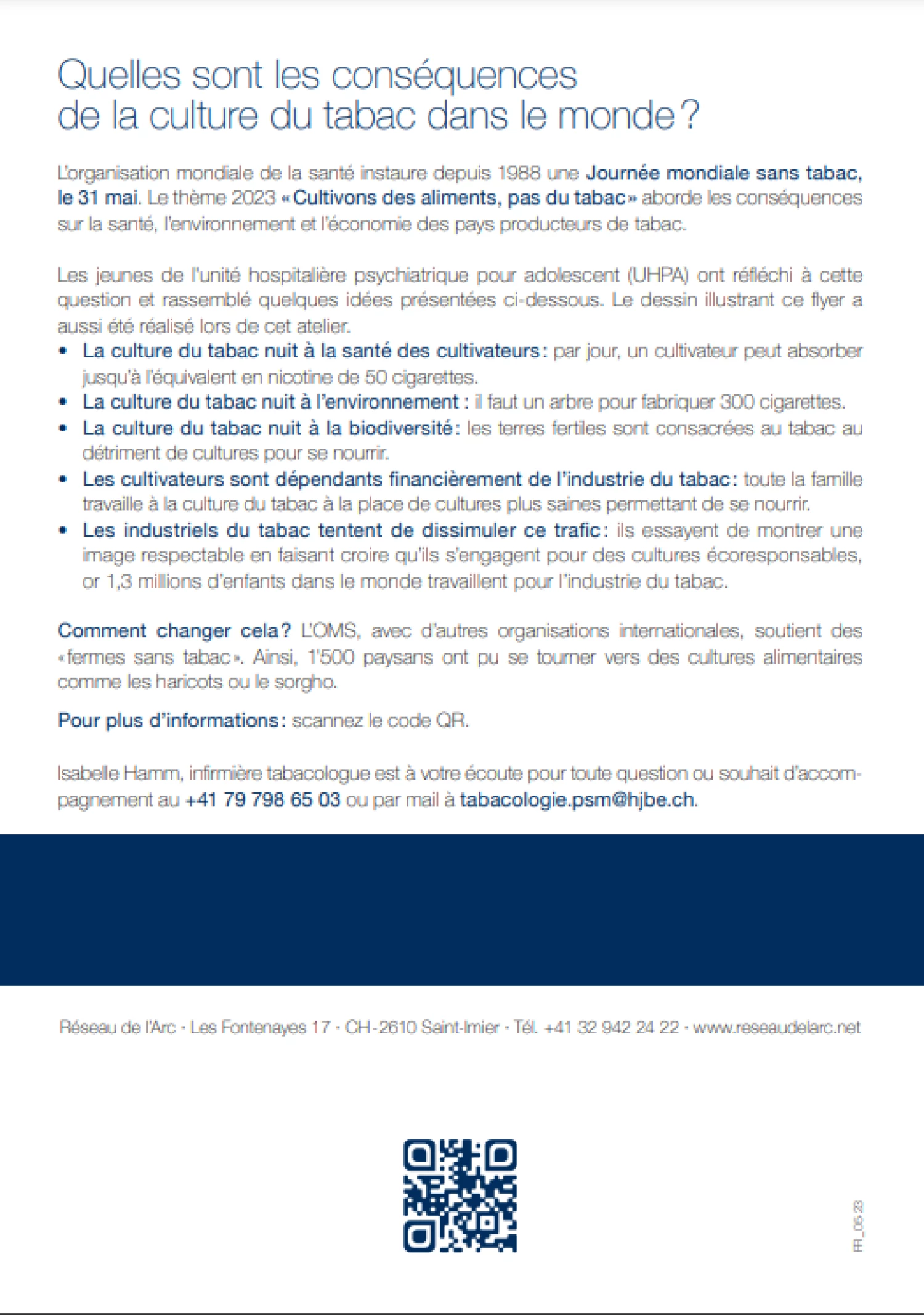Isabelle Hamm, infirmière tabacologue au sein du Réseau de l'Arc est à votre écoute pour toute question au +41 79 798 65 03 ou par mail à tabacologie.psm@hjbe.ch.