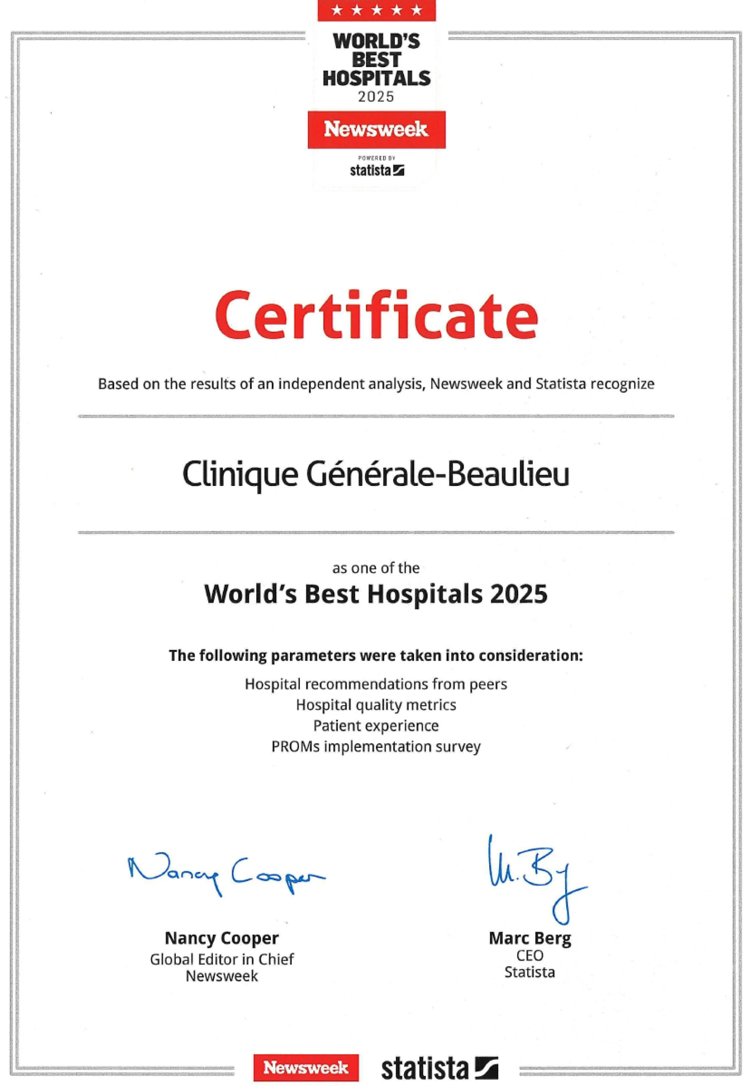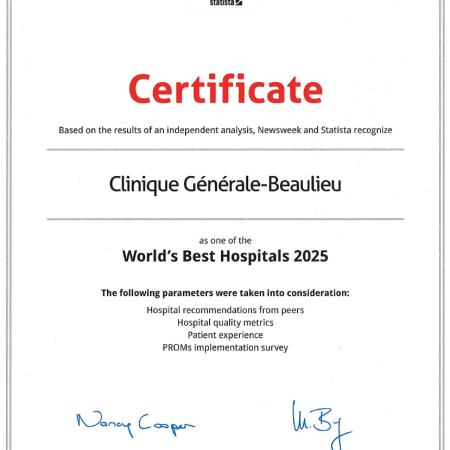 • La Clinique Générale-Beaulieu figure parmi les 250 meilleurs hôpitaux au monde pour 2025, se classant au 10ᵉ rang des meilleurs hôpitaux suisses et au 1ᵉʳ rang des établissements privés de Suisse romande.