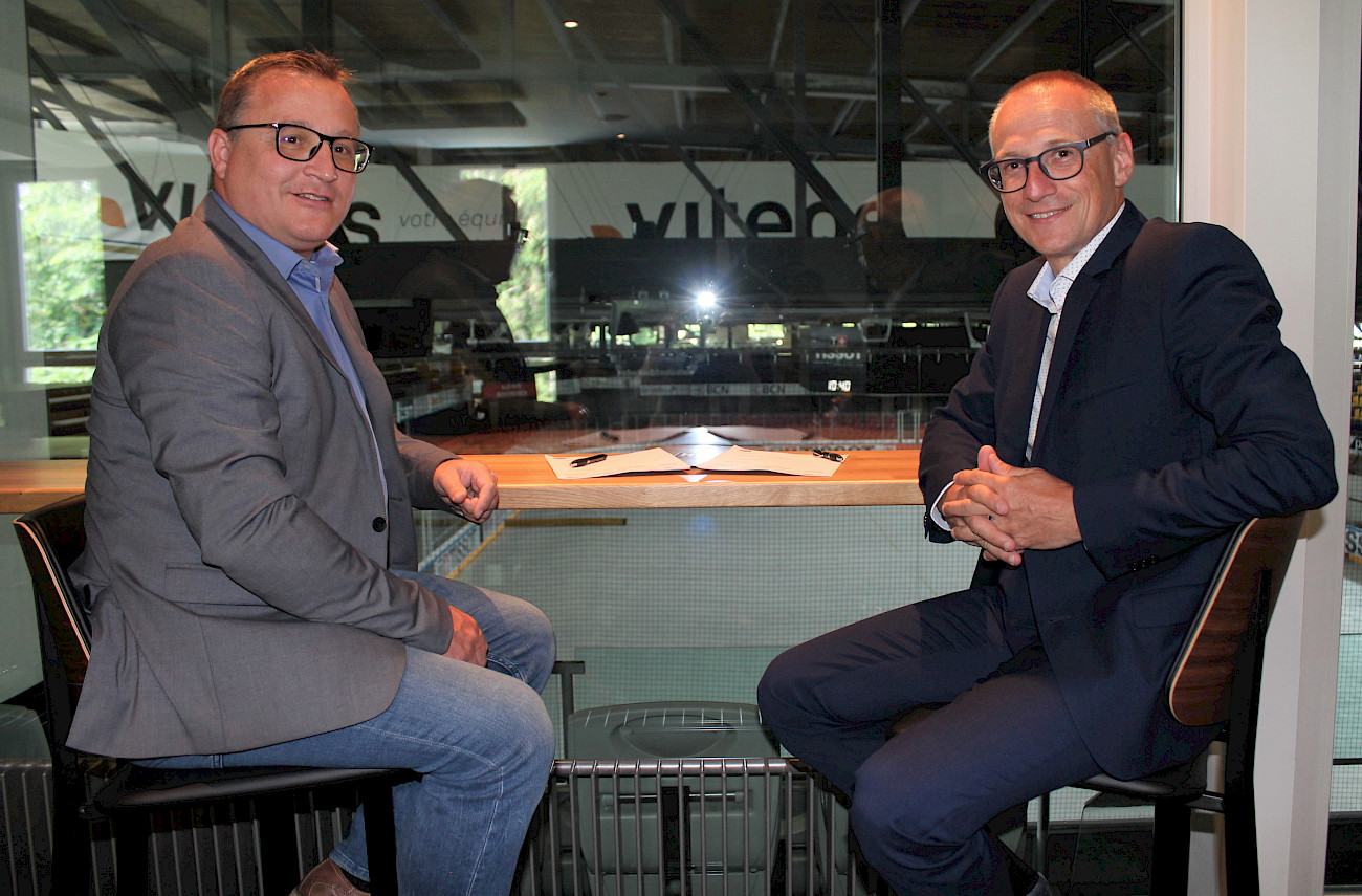 Photo: signature du contrat de sponsoring, avec le vice-président Walter Tosalli et le directeur de la Clinique Eric Fasel.