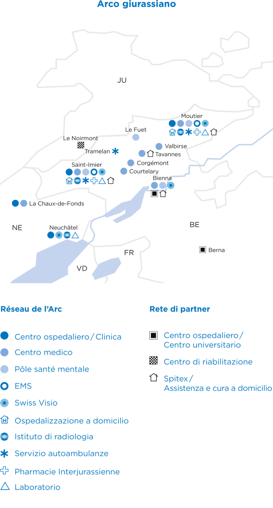 Il Réseau de l'Arc, la prima organizzazione sanitaria integrata della Svizzera, ha stabilito nuovi standard nell'assistenza sanitaria con il suo approccio innovativo. L'organizzazione comprende l'ex Hôpital du Jura bernois con le sue sedi di Moutier e Saint-Imier, diversi Medicentres e una vasta rete psichiatrica. Grazie allo stretto collegamento tra tutti gli attori del sistema sanitario, è stato possibile garantire un'assistenza sanitaria di alta qualità ed efficiente in termini di costi.
